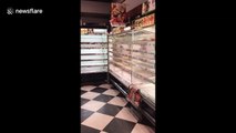 Footage has emerged of dozens of people queueing to buy the last products of a supermarket in New York City, NY, USA on Monday evening before storm Stella hit the area.