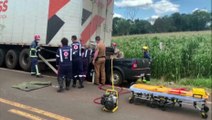 Condutor fica preso às ferragens, após bater Fiat Strada atrás de caminhão