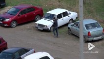 Ca partait d'une bonne et aimable idée mais ça va finir en belle gamelle : Ce matin de Mars 2017, ces 2 papys russes attendent devant l'entrée d'un immeuble lorsque une maman arrive encombrée d'une poussette et de son bébé. L'un des papys va alors tenter d'aider la maman à porter la poussette... Et c'est la gamelle! Bien ridicuel...