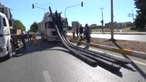 Kamyonun devrilmesiyle içerisindeki inşaat demirleri yola savruldu.