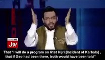 Aamir Liaquat Hussain is a Pakistani politician and broadcaster. He had hosted "Aalim Online", "Subh e Pakistan" and "Inaam Ghar" on Geo TV, previously appearing on ARY Digital and Express Entertainment as well. Hussain contested in 2002 and he was elected to the National Assembly affiliated party with Muttahida Qaumi Movement. He resigned from his post as a member of the National Assembly and from his seat as the Minister of Religious Affairs in 2007. In 2005, an investigation into his background revealed that his degrees were fake. In 2008 he was expelled from Muttahida Qaumi Movement. He is currently hosting political talk show "Aisay Nahi Chalay Ga" on Bol TV.
