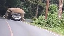 Pendant un safari, un éléphant charge soudainement un bus.