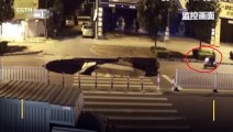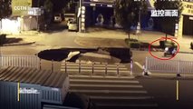 Dans la ville de Beihai en Chine, un scootériste distrait par son téléphone portable n’a pas vu la formation d’une doline au milieu de la route qui s’était créée quelque instant plus tôt.