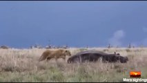 Une lionne a repéré un hippopotame sans défense couché sur le sol. Le prédateur affamé s'est approché de sa proie par-derrière. Mais l’hippopotame a fait rapidement savoir à la lionne qu'il ne fallait pas le déranger pendant sa sieste en l'attrapant par la tête.