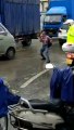 Un manifestant fait kung-fu panda à un policier