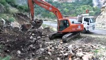 Heyelandan kapanan yol açıldıDENİZLİ - Denizli'nin Honaz ilçesinde şiddetli yağış nedeniyle meydana gelen heyelanda devasa taşlar karayoluna düştü.