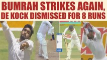Indian bowler Bhuvneshwar Kumar is on fire today as he once again strikes, this time dismissing Quinton de Kock. This is wicket number four for the Indian speedster who started off the day on a great note getting his team 3 early break through. South Africa won the toss and elected to bat first against India in the first test match in Cape Town. India has got off to a dream start in the 1st test match against South Africa thanks to a superb bowling by Bhuvneshwar Kumar . Bhuvi dismissed 3 batsmen of the host team in the first 22 minutes of the game. Watch this video to find out more.