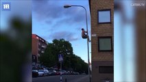Il grimpe à un lampadaire pour faire des tractions à plus de 6m de haut... Risqué