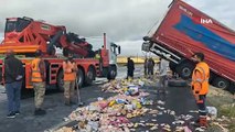 Bariyere saplanarak devrilen TIR'daki meyveler yola saçıldı