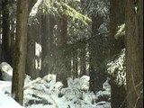 Melting snow falling from the trees, birds chirping and children laughing in the background, birds flying by.