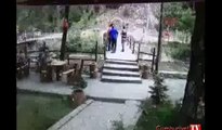 Trabzon'un Çaykara ilçesi Uzungöl'de dağdan kopan dev kaya kütlesi yola düştü. Bu sırada yoldan geçmekte olan bisikletliler, yayalar ve bir araç son anda dev kayanın altında kalmaktan kurtulurken, o anlar güvenlik kameraları tarafından saniye saniye kaydedildi. \r\n\r\nOlay Trabzon'un turizm merkezlerinden biri olan Uzungöl'de perşembe öğle saatlerinde meydana geldi. Bir parkın yakınında; bisikletliler, yayalar ve bir otomobil seyir halindeyken henüz bilinmeyen bir nedenle dev kaya kütlesi yerinden koparak yuvarlanmaya başladı. Bunu farkeden bir kişi yoldakileri bağırarak uyardı. Kaya yola düştüğü sırada vatandaşın uyarısıyla otomobil ve bisikletliler hızlarını arttırarak kayanın altında kalmaktan son anda kurtuldular. Bir bisikletli kayanın geldiğini gördükten sonra geri dönerek kurtulmayı başardı. Vatandaşın uyarısı ile facianın eşiğinden dönülmesi ve yaşananlar parkın güvenlik kamerası tarafından saniye saniye kaydedildi.
