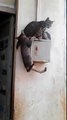Un jeune chat fait preuve d'une grand détermination pour rejoindre ses deux potes qui sont tranquillement perchés sur un boitier électrique. Après de multiples efforts, il parvient à grimper sur le boîtier mais celui-ci s'avère trop petit pour accueillir les trois chats en même temps.