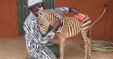 Ces gardiens portent une veste à rayures pour nourrir un petit zèbre orphelin