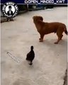 this duck is too clever for the simple-minded dog, it played dead in front of the dog and ran for it when the dog was gone from its sight.