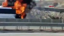 - Drone görüntüleri - İtfaiyenin söndürme çalışması - Otoyolda oluşan araç kuyruğuBURSA (AA) - Bursa 'da seyir halindeki yolcu otobüsü yanarak kullanılamaz hale geldi.Balıkesir'den İstanbul'a giden Yusuf Çolak (50) idaresindeki yolcu otobüsünün motor bölümü, Gebze - Orhangazi - İzmir Otoyolu Gemlik Karsak kavşağı yakınlarında alev aldı.Alevleri fark eden sürücü, aracı emniyet şeridine çekerek yangına müdahalede bulundu.Aracı kaplayan alevler, itfaiye ekiplerinin müdahalesiyle söndürüldü.Yolcunun bulunmadığı otobüs kullanılamaz hale geldi