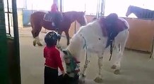 Une petite fille essaie de monter sur un très grand cheval !