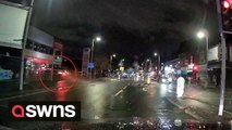 Moment car speeds through T-junction and smashes into building