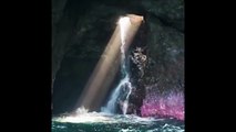 Il plonge du haut d'un rocher dans une caverne magnifique