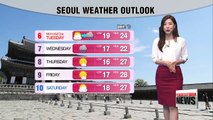 Highs will range from 21 to 23 degrees Celsius... Seoul and Gyeongju will reach 22 degrees, Daegu, Daejeon and Chuncheon will get up to 21 degrees.