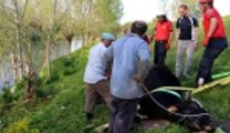 Dere yatağına düşen inek vinçle kurtarıldı