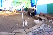 Rocky the dog came to the rescue to break up a fight between two roosters. He stood in between them as a barrier, holding them off as they kept trying to peck each other.