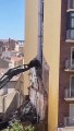 La façade d'un immeuble se détache à cause du vent et chute sous les yeux des passants