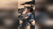 Adorable 2-year-old girl is very tired of deer bothering her