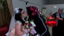 - Zihinsel engelli Sümeyye Üçtaş için düzenlenen düğünden görüntülerEngelli genç kızın düğün hayali gerçek oldu - Zihinsel engelli Sümeyye Üçtaş, kendisi için düzenlenen temsili düğünde gelinlik giymenin mutluluğunu yaşadı - Anne Aysun Üçtaş: - "Düğün çok güzel oldu, çok mutluyuz" - AK Parti Sarıyer Belediye Başkan Adayı Salih Bayraktar: - "Mutluluğu yüzünden okunuyor, biraz da heyecanlı kendisi. Gelinlik çok güzel oldu, çok da yakıştı. Gerçekten anlamlı bir gün. Bunlar güzel sosyal faaliyetlerdir. Belediyecilik doğumdan ölüme kadar hizmet etmedir"İSTANBUL (AA) - Zihinsel engelli 22 yaşındaki Sümeyye Üçtaş'ın hayali, kendisi için düzenlenen temsili düğünle gerçeğe dönüştü.Sarıyer Kültür Merkezi'nde gerçekleştirilen temsili düğüne Üçtaş, müzik eşliğinde gelinliğiyle geldi.Üçtaş, pasta kesilen ve kendisine takı takılan programda, müzik eşliğinde akrabaları ve arkadaşlarıyla eğlendi.Anne Aysun Üçtaş, yaptığı açıklamada, kızının düğünlere gittiğinde kendisine sürekli "Benim düğünüm ne zaman olacak?", "Ben ne zaman gelinlik giyeceğim?" diye sorduğunu söyledi.