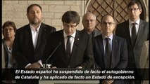 Después de que Mariano Rajoy anunciara las medidas de la aplicación del artículo 155 de la Constitución a Cataluña, el president, Carles Puigdemont, contesta de manera tajante, afirmando que esta actuación supone el "peor ataque a las instituciones catalanas desde los decretos de la dictadura de Francisco Franco". Puigdemont convoca un pleno en el Parlament para decidir la respuesta de la Generalitat a la "liquidación del autogobierno" por parte del Ejecutivo y lanza un mensaje a los demócratas españoles para advertir que estos ataques a Cataluña abren la puerta a otros abusos de la misma índole en cualquier parte.