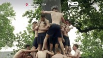 Members of U.S. Naval Academy's first-year class tested their ingenuity, perseverance and ability to work together as they attempted to scale a granite obelisk coated with a thick layer of vegetable shortening.