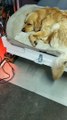 A tired Golden Retriever rests on a trolley after a busy day at a pet show. The pooch was visiting the Pet Expo Thailand 2019 in the Bangna district of the capital.