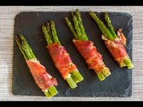 Rollos de espárragos horneados con queso y jamón serrano