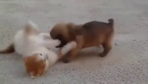 Adorable cat and lovely puppy fighting with Each Other