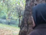 Quita gets on a Thames Clipper on the London embankment, gets soaked in front of Tower Bridge, rides on a double-decker bus and playfully climbs on top of a sundial in a park.