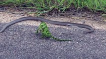 Un caméléon face in un gros serpent sauvé de justesse