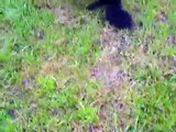 This border collie was doing jump training outdoors with his owner. His owner kept a frisbee high up in the air, coaxing him to jump and catch it. However, when he leaped up to grab it, he fell backward to the ground.