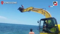 Gençlerin iş makinesiyle deniz keyfi kamerada
