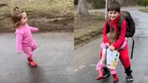 Toddler Laughs as Elder Brother Entertains by Blowing Party Whistle