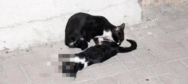 ( MERSİN ) - Mersin’in Tarsus ilçesinde otomobilin altında kalarak ölen yavrularını yalayıp başında bekleyen anne kedi, görenlerin yüreğini burktu MERSİN