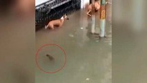 Sel suları ile şehre gelen timsah köpeğe saldırdı