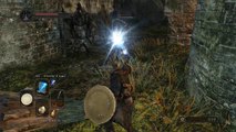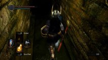 ...courant à travers le Ravin Noir dans tout son dégoût - du poison étant craché dans toutes les directions pendant que les flaques d'huiles sur le sol rappellent qui y réside, je tombe sur le rebord où le dirigeant du Serment des Pèlerins des Ténèbres toujours attend - je me dis: "J'ai quelques effigies de plus, je ne les utilise pas pour restaurer mon humanité en tout cas, je veux juste terminer avec ce Gouffre Obscur une fois pour toujours!", donc j'ouvre le portail et je m'y rends encore une fois. Le personnage cuirassé - comme d’habitude - fait de dégâts énormes au jambon avec ses deux grands marteaux mais je remarque que si j'applique des coups d'estocs avec mon espadon de chevalier noir, la "tortue sombre" roule en arrière et de plus, son armure est trop lourde pour que cette action de retraite peut avoir lieu optimalement rapidement - je meurs sur cet essai aussi mais sur le suivant, mes coups forts, en effet, forcent cet adversaire de reculer...seulement pour qu'il soit remplacé par le pyromancien, incinérant le jambon avec des sorts incessants d'une puissance énorme qui lui permettent de blesser notre personnage aussi fortement que les marteaux mais de distance, voulant dire que je ne peux pas l’atteindre, même avec la portée que la gaufrette me donne. Enfin, quand je décide à passer ces deux et l'arbre-clerc qui les accompagne, allumant le bougeoir et courant vers la sortie, je ne trouve que de la brume qui m’empêche de m'en aller et l'autre trio qui marque la dépensée de mes effigies.