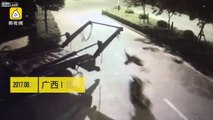 Ce motard se fait étrangler par la chaîne dépassant d'un camion benne !