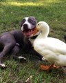Ce canard vient embeter un pitbull et mettre son bec dans sa bouche