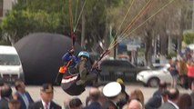 Kahramanmaraş'ın Ahir Dağı'ndan havalanan ve ismi öğrenilemeyen yamaç paraşütçü, gökyüzünde süzüldükten sonra iniş yerini tam olarak ayarlayamayınca trafiğin yoğun olduğu karayoluna inmek zorunda kaldı. O anlar çevredekiler tarafından kaydedildi. (İHA)