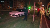 ( İSTANBUL - ÖZEL)-Yağmurun etkisiyle yoldan çıkan kamyon kamerada- Oto yedek parça taşıyan bir kamyon önce aydınlatma direği ve ağacı devirdi daha sonra duvara çarparak durabildi İSTANBUL