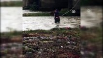 Beline bağladığı halatla suyu geçen Görele Belediyesi İtfaiye Müdürlüğü personeli, köpeğe ulaştı.