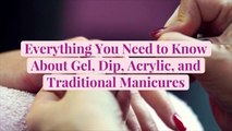 Learn the DifferenceBetween a Gel, Dip, Acrylic,and Traditional Manicure Once upon a time, a manicure meant afew swipes of polish on your nails, but nowyou can get gel, acrylic, or dip manicures. So what's the difference between them? A traditional manicure is the fastest,cheapest, and easiest to do yourself,but it only lasts for about a week. With a gel manicure, the gel can lastup to two weeks, but it does requirea UV light for the drying process. Acrylic nails are best if youare wanting extra long length. They last 2-3 weeks, but should be applied and removed by professionals for best results. Dip powder manicures can last up to four weeks and don’t require a UV lamp,but the removal process can be lengthy.