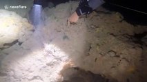 Video shows the heroic moment scuba divers rescue a sea turtle after it was stuck in a rubbish trap of plastic bottles and fishing lines.