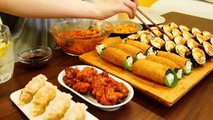 ASMR MUKBANG Spicy Sticky Noodles, Kimbap, Seasoned Chicken, Fried Tofu Rice balls, Dumplings.