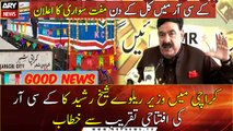 Railway Minister Sheikh Rashid addresses the inauguration ceremony of KCR in Karachi